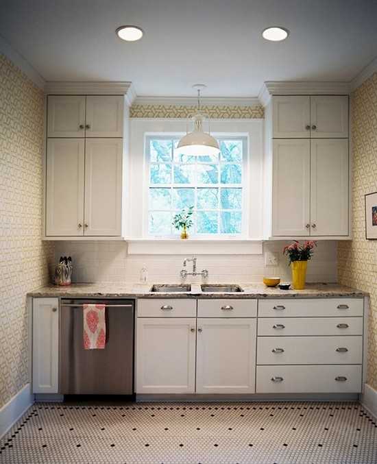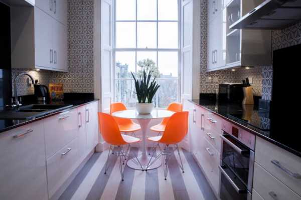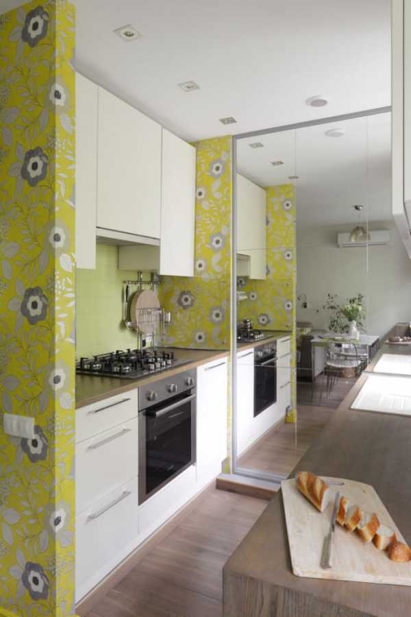 В узкой кухне нужно ценить пространство. Поэтому старайтесь задействовать весь периметр комнаты для своих нужд.