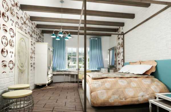 - Потолочные балки, параллельные коротким сторонам помещения, также помогут воспринимать его иначе, визуально расширить узкую комнату. Они могут быть чисто декоративными, выполненными из гипсокартона. Очень уместно такое решение в популярном сегодня средиземноморском стиле оформления жилья.