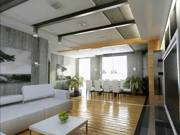 - Разбить комнату на зоны можно при помощи линии – зонирование предполагает использование разных отделочных материалов.