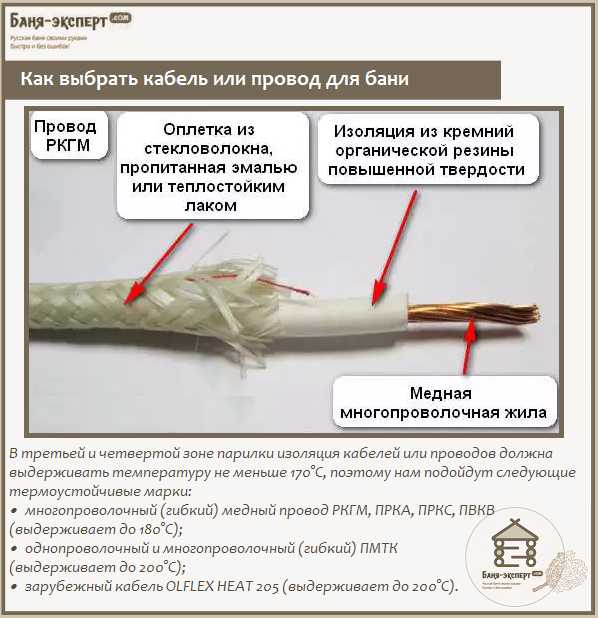 Непосредственно в парилке единственными разрешенными к использованию электроприборами являются осветительные лампы. Для их подключения предназначены кабели, устойчивые к воздействию влажности и экстремальной температуры воздуха, к примеру, РКГМ либо ПРКА.