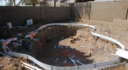 Перед тем как начинать работу со стенками, надо учесть необходимость монтажа системы слива воды.- Следующий этап работ — опалубка.