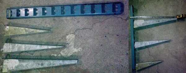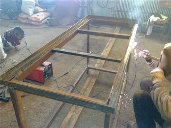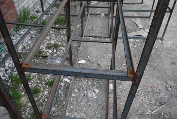 - Стойки делают из профтрубы, а поперечины из уголка. Толщина металла 2-3 мм, ширина полки — 25 мм и больше. Разворачивают уголок так, чтобы укладываемый настил был как в «гнезде».
