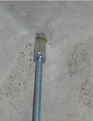Длинные металлические шпильки соединяются с анкерами, размещенными на потолке. Фиксируется соединение с помощью гаек-муфт. Также желательно подстраховать соединение дополнительной обычной гайкой, которая наворачивается на резьбу шпильки.
