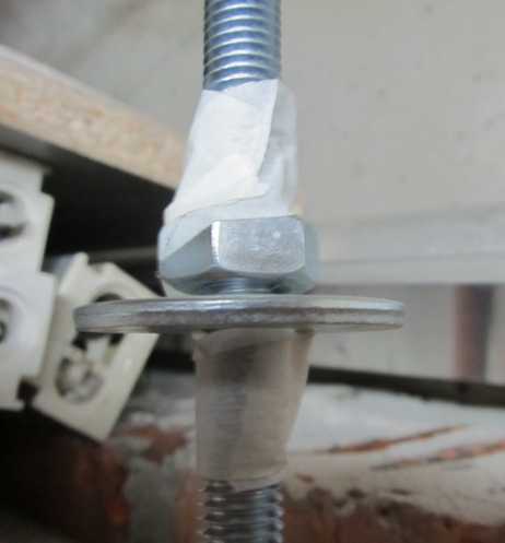 Фиксация полки осуществляется с помощью шайбы Гровера и контрольной гайки. Шайбы защищают отверстия полки от излома при нагрузках. Гровер служит защитой от развинчивания крепежной гайки. Можно для безопасности и большей прочности конструкции использовать две гайки. Конечная подгонка крепежной фурнитуры осуществляется по уровню.