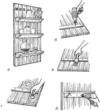 Шаг 3. Затем с помощью электролобзика выпиливаются полки с боковыми стенками. Боковые стенки полочек можно сделать такого же размера, как и длина щита. Далее с помощью длинных саморезов собирается конструкция полки и крепится на поверхность щита. Место для хранения баночек и коробочек с гвоздями и другими мелкими вещами готово.
