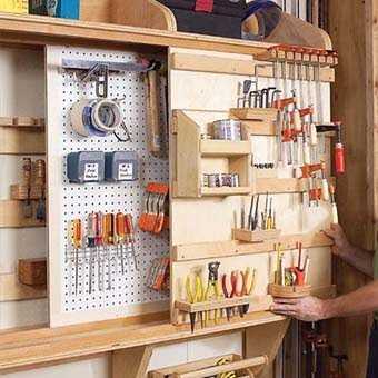 Для того чтобы весь мелкий инструмент был под руками во время слесарных или столярных работ, можно продумать и изготовить специальный щит. Полки-щиты не отличаются большой грузоподъемностью и прочностью, на них нельзя складировать тяжелый инструмент, а вот для мелких и нужных вещей, которые всегда теряются, такая конструкция будет идеальной.