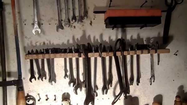 - Для более тяжелого оборудования — больших ключей и т.д. можно использовать сетку, на которую наварить из поволоки крючки. Сетку прибить на стену.