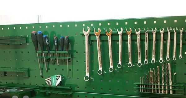 Что касается стенда для инструмента. Есть заводской вариант — перфорированный лист металла с навешиваемыми на него держателями. Идея очень неплоха за исключением цены.