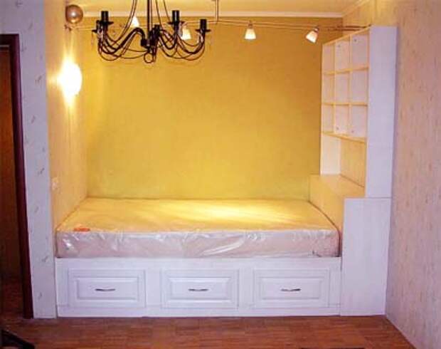К слову, возвышение может быть выполнено не только в виде короба. Оно может, например, представлять собой систему полок, одновременно служащих ступеньками. Такая конструкция вряд ли кого-то оставит равнодушным. Но, конечно, значительно снижается возможность организации мест размещения вещей.