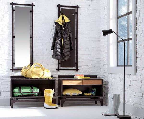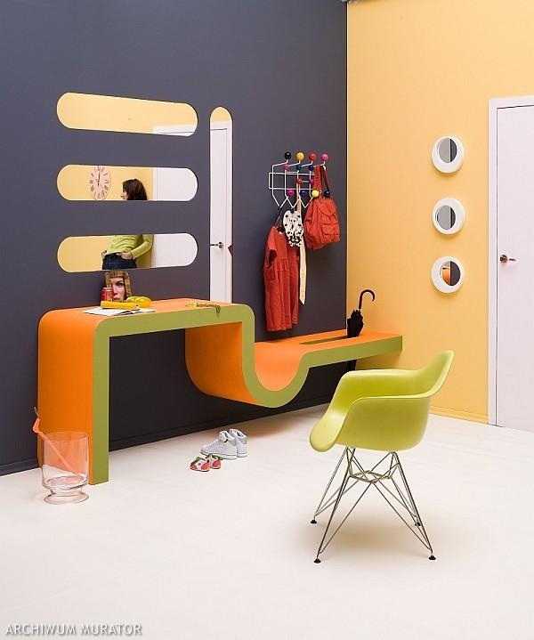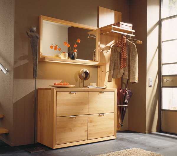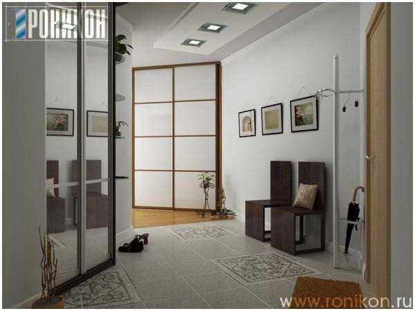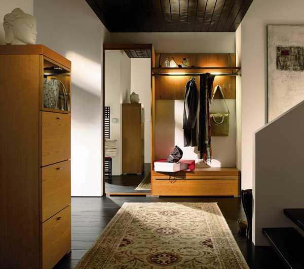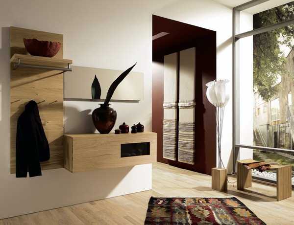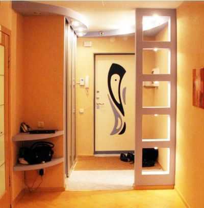 - Очень важна мебель и ее расстановка. Для прихожей скромных габаритов подойдет встроенная мебель. В коридорах побольше можно установить шкаф-купе, разместить полки. Если позволяет дизайн, украсьте интерьер необычными по цвету и форме открытыми стеллажами.