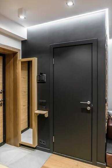 Лучше приобретать межкомнатные двери одной серии у одного производителя. Чтобы входная дверь хорошо сочеталась с интерьером прихожей, ее внутреннюю облицовку можно сделать из доборов межкомнатных дверей.