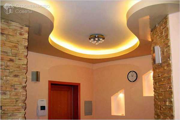 - Многоуровневый гипсокартоновый потолок станет очень удачным выбором, как по трудозатратам, так и по стоимости. Изогнутые линии помогут зрительно расширить при необходимости узкий коридор и украсят любое помещение.