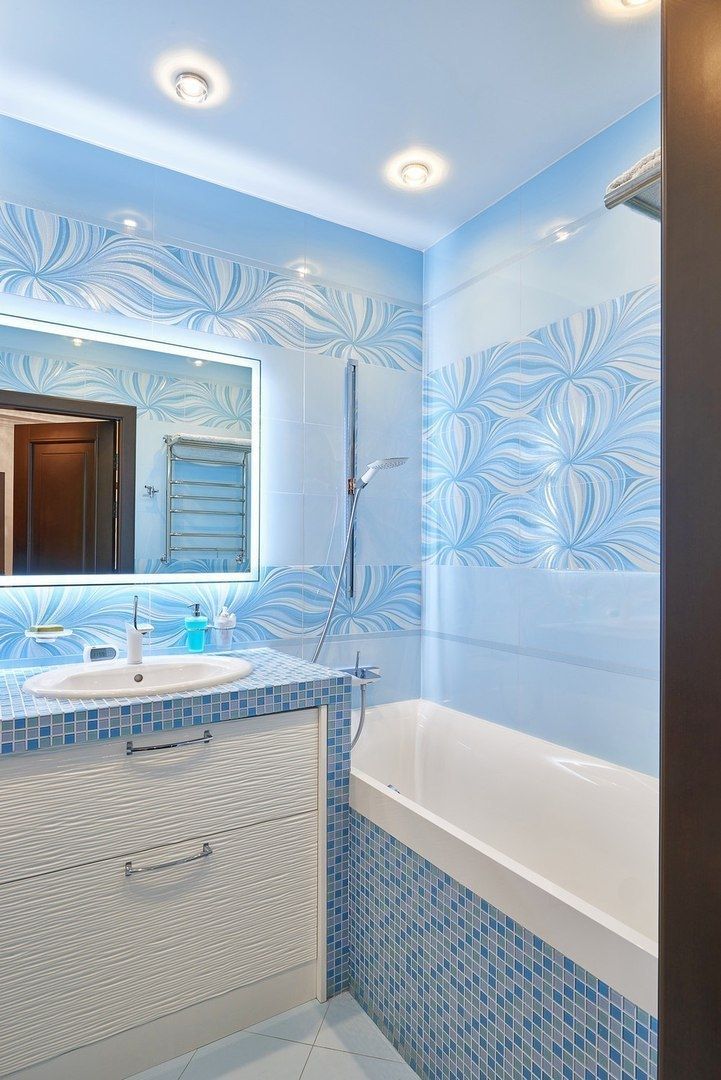 крупные рисунки на стенах, полу или на потолке – ваша ванная может визуально
