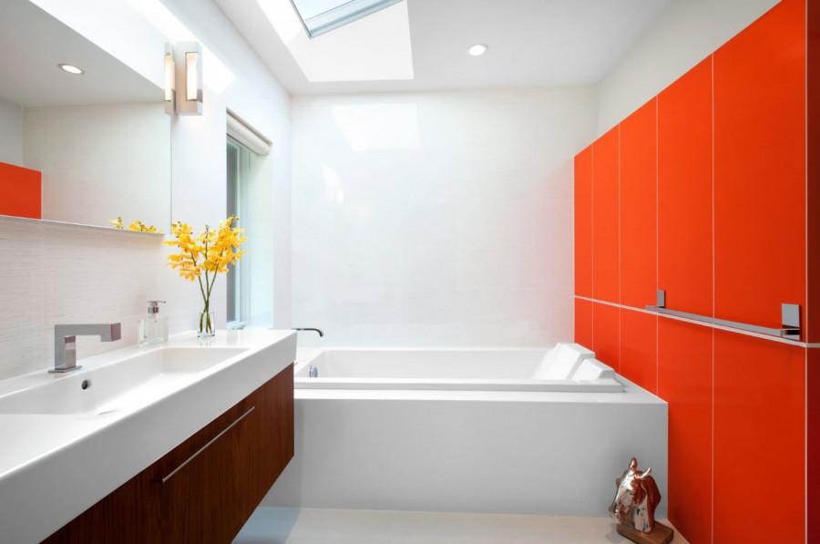 Привнесите яркость и контраст в свою маленькую ванную комнату, покрасив плинтусы и обивку дверей в яркий оттенок. Владелец этого дома в Канзас-Сити применил этот дизайнерский трюк.