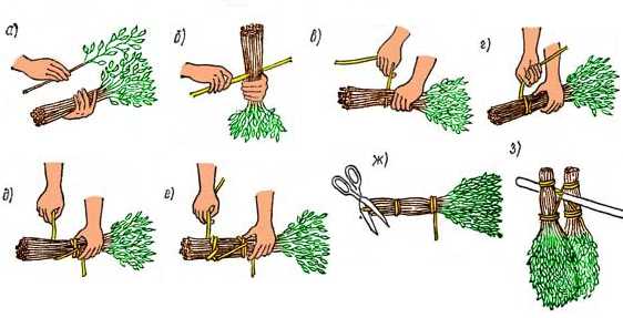 - Крепко связываете ручку, следите за тем, чтобы веточки лежали плотно к друг другу.