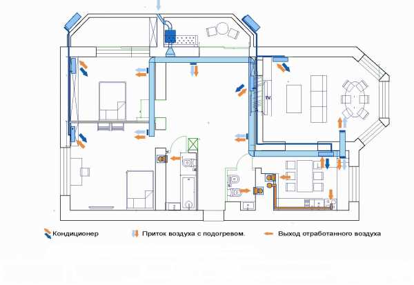 Теперь стоит поговорить об организации оттока. В данной ситуации естественный отток организовать не удастся, поэтому применяется исключительно принудительный метод. Для этого используется система вентиляторов, которая вытягивает из жилых помещений воздух в нежилые.