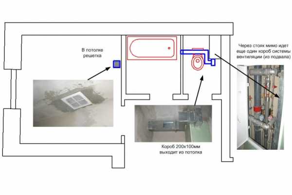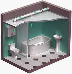 Как правило, вентиляция в ванной проектируется с естественной тягой без механического побуждения. Работает вентиляция в ванной по принципу тяги в печной трубе – теплый воздух подсасывается под дверь в ванную и потом поднимается вверх, тяга создается за счет разности температур наружного уличного воздуха и воздуха в квартире.