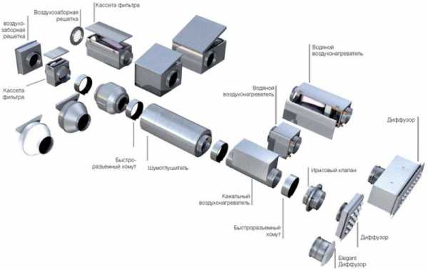 Обычно все воздуховоды монтируют в чердачном помещении или под навесным потолком. Все виды оборудования, куда входят:
