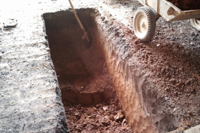 - Вначале вдоль боковой стены гаража, поближе к воротам, откапывается небольшая траншея, заглубленная ниже уровня пола.