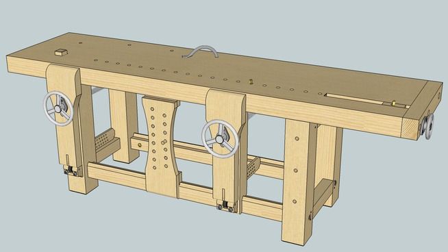 Он имеет максимальную длину до шести метров, что позволяет закреплять на поверхности столешницы очень толстые и длинные доски и прочие пиломатериалы. Кроме этого, на поверхности устройства устанавливаются фиксаторы для пиломатериалов, чтобы в процессе обработки доски оставались неподвижными. - Столярный верстак имеет рабочую поверхность, которая всегда крепится на прочном каркасе. Столешница, как правило, изготавливается из крепкого металла или плотного дерева (дуб или бук), благодаря чему на ней можно обрабатывать различные металлические части, не боясь повредить покрытие. Основанием служат две крепкие опорные стойки, скреплённые продольными брусьями. На передней поверхности столешницы размещают рабочие тиски для фиксации металлических деталей, а на задней делается прямоугольный вырез, служащий для перемещения дополнительных тисков. В столешнице проделывают отверстия для установки упоров или струбцин, необходимых для столярных работ.