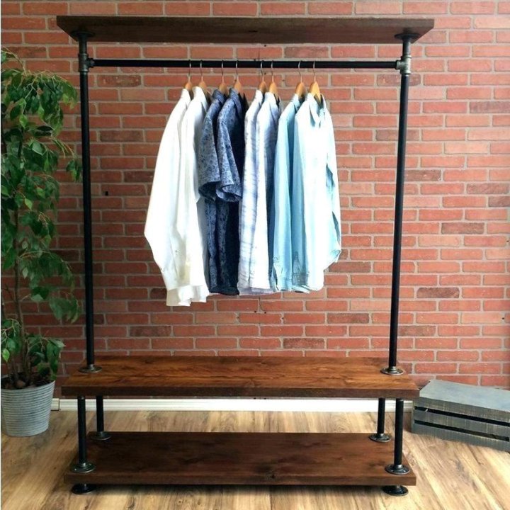 Помимо рассмотренных простых конструкций, есть варианты и с большими габаритами. Самостоятельно можно сделать вешалку, которая подойдет под целый гардероб одного человека. Для конструирования подготавливают такие элементы: