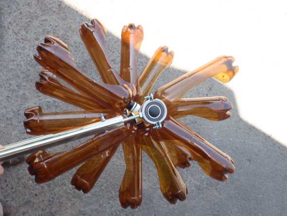 На станке делают втулку и фиксируют в разъёме от лопастей разобранного вентилятора. В эту втулку будет крепиться генератор. После закрепления, нужно заняться изготовлением корпуса для будущего ветряка. Срезают с помощью станка или в ручном режиме дно от бутылки шампуня. Во время отрезания, требуется также оставить отверстие на 10, чтобы в него вставить ось, выточенную из алюминиевого прута. Прикрепляют её с помощью болта и гайки к бутылочке. После того как была выполнена припайка к генератору всех необходимых проводов, в корпусе бутылочки проделывают ещё одно отверстие для вывода этих самых проводов. Протягиваем их и закрепляем бутылочке сверху на генераторе. По форме они должны совпадать и корпус бутылки должен надёжно скрывать все его части .