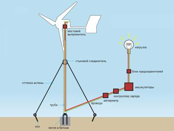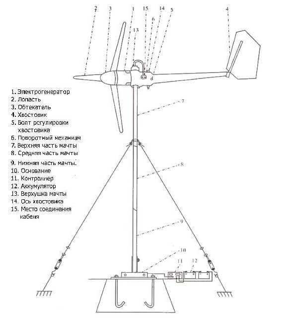 Ветровая электростанция состоит из ветровой турбины; одной или нескольких батарей хранения энергии, произведенной генератором; блокирующего диода, предотвращающего вращение двигателя от запасенной электроэнергии аккумулятора и балластной нагрузки избыточной энергии, когда батареи полностью заряжены; контроллера заряда для запуска всей системы.