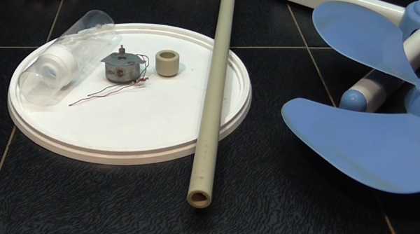 Сам вентилятор может быть внерабочем состоянии, но из него требуется всего несколько деталей — это стойка и сам винт. Для конструкции понадобиться небольшой шаговый двигатель спаянный диодным мостиком для того, чтобы он выдавал постоянное напряжение, бутылочка от шампуня, пластиковая водопроводная трубка длиной примерно 50 см, заглушка для неё и крышка от пластикового ведра.