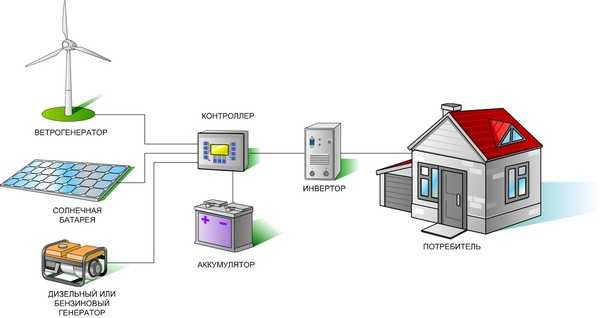- Ветрогенератор, о котором мы уже говорили. Добавить здесь можно только то, что вырабатываемая им энергия напрямую не используется – все электричество собирается в аккумуляторы, откуда и идет дальнейший его разбор.