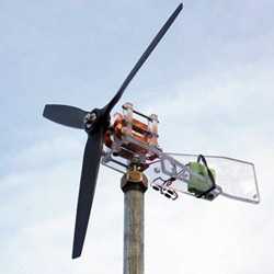 Меня разбирало любопытство, как это все-таки будет работать. Чтобы протестировать систему, выйдя на улицу одним ветреным днем, просто поднял повыше над головой. Лопасти раскрутились за считанные секунды (без подключения к генератору). Я держал в своих руках бешено вращающуюся юлу смерти, не зная, как опустить ее, чтоб лопасти не четвертовали меня. К счастью, в какой-то момент порыв ветра стих и мне удалось остановить эту махину. Вряд ли еще когда-нибудь повторю эту ошибку.