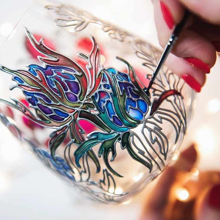 Такие краски какGalleryGlade, производимые компаниейPlaid, гораздо гуще, чем лаки, и дают возможность работать даже с вертикальными поверхностями. Густыми красками можно добиваться эффекта рельефности стекла и делать разноцветные разводы.