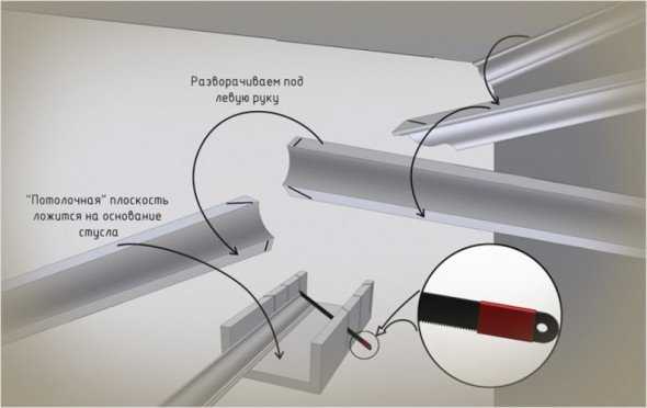 С внутренним углом потолочного плинтуса ситуация очень похожа. Сначала примериваете, какая сторона окажется на потолке, эту часть прижимаете к дну стусла, вторую часть опираете на ближнюю к вам стенку и делаете запилы так, как нарисовано на фото ниже.