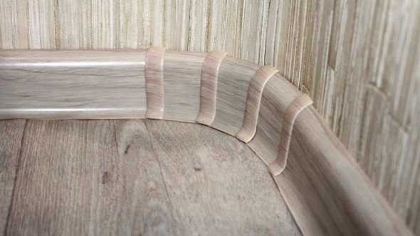 Перед поклейкой их прикладывают к стене и при необходимости корректируют небольшие неровности. Щелей между плинтусами быть не должно. Если такая работа выполняется впервые, можно потренироваться на маленьких кусочках.