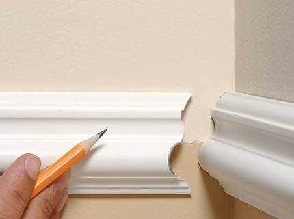 Для этого разметка выполняется прямо на стене. Сначала отмеряют требуемую длину декоративного изделия. Его обрезают под прямым углом. Далее прикладывают каждую деталь к потолку. Их контур обводят при помощи карандаша. При этом получается пересечение. Его наносят на оба плинтуса.