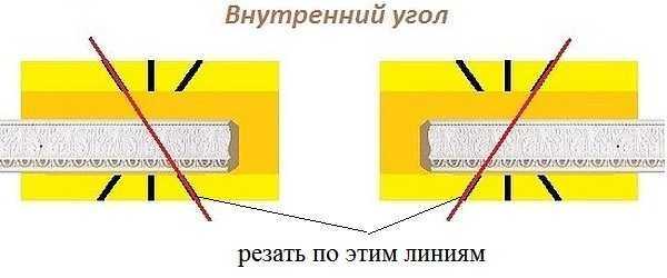 В первую очередь необходимо рассмотреть методику, как вырезать внутренний угол потолочного плинтуса. Ведь в любой комнате они есть. Если внешние углы в обычных прямоугольных помещениях отсутствуют, то эти разновидности придется вырезать в любом случае.