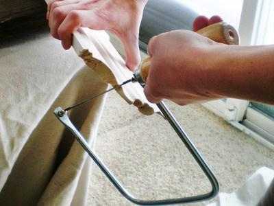 Для распила галтелей также можно использовать ручной лобзик. При резке изделий таким инструментом углы получаются максимально ровными. Но у этого приспособления есть несколько недостатков. Из-за малой длины режущего полотна использование стусла (специальный инструмент для резки плинтуса) становится очень проблематичным. К тому же, распил выполняется медленно.