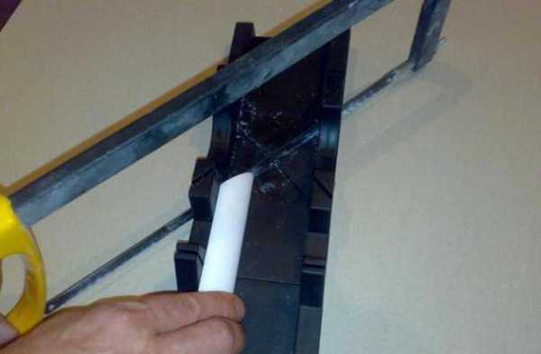 Если углы и стены в помещении ровные, можно использовать специальный столярный инструмент — стусло. Это желоб в виде перевернутой буквы «П», в котором намечены линии для пропила под углом 90° и 45°. Внутрь укладывается деталь, в которой нужно сделать запил, в направляющие вставляется пила. Деталь удерживается на месте, отрезается под требуемым углом.