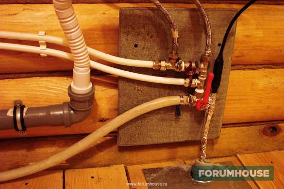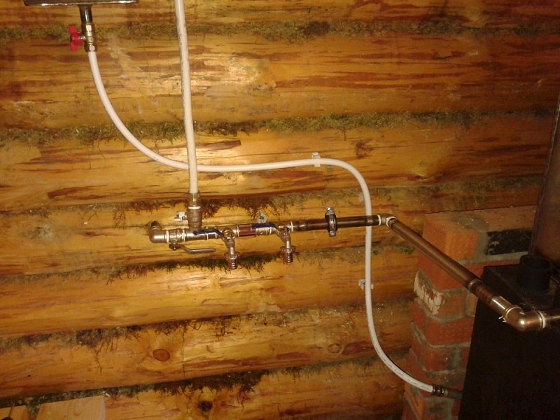Внутри банного помещения пластик можно применять без ограничений. При закрытом вентиле для водной подачи и открытых кранах вода всегда будет сходить в нижнюю точку водопровода, которую обычно оборудуют линией жидкостного сброса. Исключением станет переход от коллектора водопровода до бака и крана для горячей воды в парилке. Такую часть магистрали для воды в бане делают из 0.5 дюймовой трубы из стали.