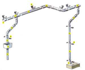Водосточная система состоит из 6 элементов: желоба, трубы, повороты, воронки, заглушки ну и, конечно же, элементы крепления.