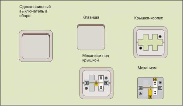 Как подключить выключатель с одной клавишей – конструкцияВыключатель – механическое устройство, предназначенное для включения-выключения осветительных приборов. Для начала, чтобы дальше было легче работать, разберем выключатель для скрытой проводки и посмотрим, из чего он состоит: