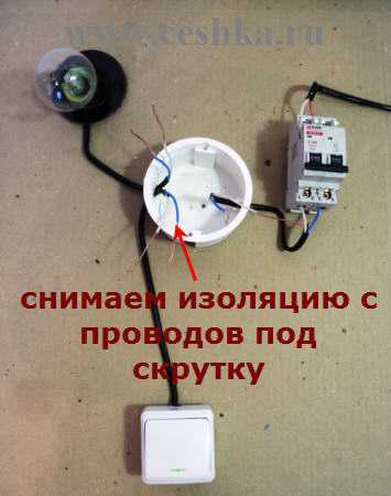 - Обрабатываем концы провода для подключения в коробке, лампе и к выключателю.