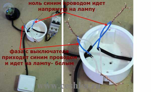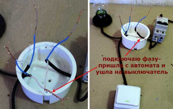 - Фазный провод питающего кабеля соедините с любым из двух проводов, идущих от выключателя.