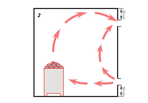 В такой ситуации сама собой напрашивается принудительная система. Но и естественная вентиляция способна справиться со столь большой кратностью воздуха — к примеру, конвекционная вытяжка типа басту. (То есть в финской бане неплохо применить шведскую технику.) Тем более, что она крайне проста. «Двигателем» этой вентиляционной системы является печка. В сауне она работает до конца процедур, поэтому двигатель «включен» по умолчанию.