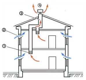 На рисунке цифрами обозначено: 1- вентиляционная решетка в ванной на 1 этаже; 2 - приток уличного воздуха через окна; 3 - общий вытяжной канал с выходом на крышу; 4 - дефлектор вентканала.