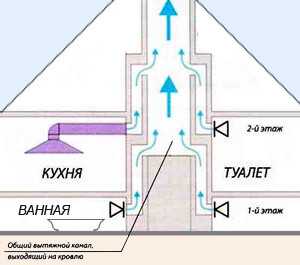 Как уже было сказано выше, для более надежной тяги, рекомендуется увеличивать высоту столба вытягиваемого на улицу воздуха. Поэтому, если у вас двухэтажный дом – ванную лучше расположить на первом этаже.