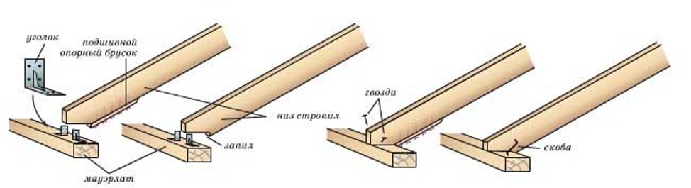 В зависимости от конструктивного решения, наличия внутренних стен и расчетной нагрузке применяют различные виды крепления. Каждое из них подразумевает собственный вариант подготовки стропил для стыковки с мауэрлатом.