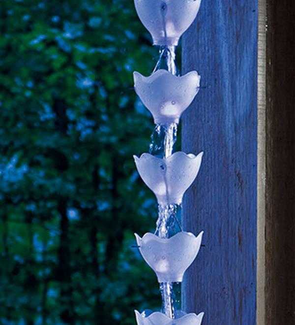 «Цепочки» могут быть самыми разными: из разноцветных пластиковых ведерок, вазочек и других красивых ярких штучек. Крепить такие цепочки можно к самой нижней точки крыши, а вода свободно будет стекать вниз, куда, кстати, можно поставить какую-либо емкость.