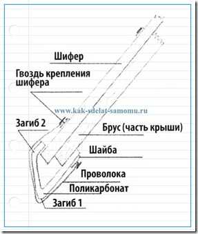 К этим же гвоздям крепятся полуметровые медные или стальные проволочки. Далее поликарбонату без особого труда придается необходимый угол – собственно, сам желоб (загиб 1). При раскрое желоба оставлено 10 см запаса для еще одного загиба (загиб 2).