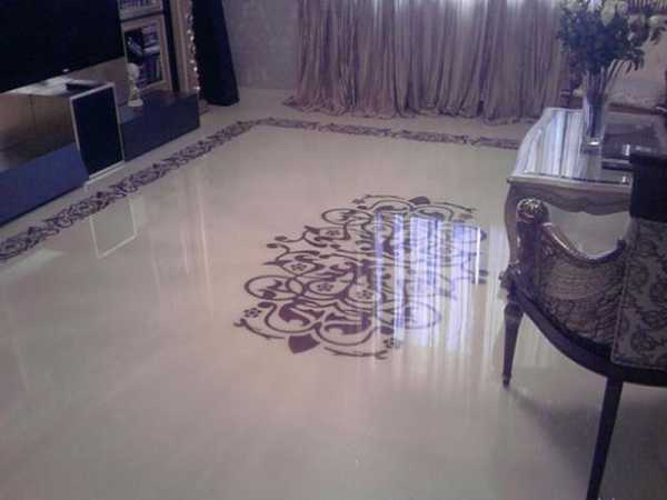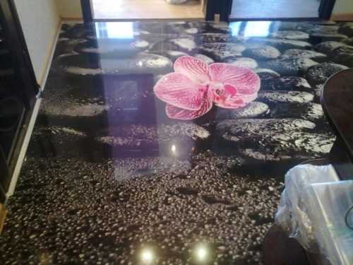 - — во время монтажа готовый рисунок клеится на основание, которое обработано специальными полимерами. Готовое покрытие заливают составом со специальными добавками. Благодаря им, пол остаётся прозрачным, целостным, без швов. Именно благодаря этим факторам, достигается особая привлекательность такого пола;