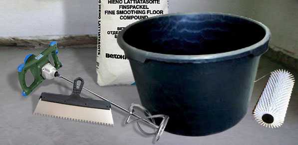 - Для заливки полов понадобится: сама смесь, емкость в которой она будет смешиваться с водой, электродрель с насадкой-миксер, шпатель, игольчатый валик, правило.